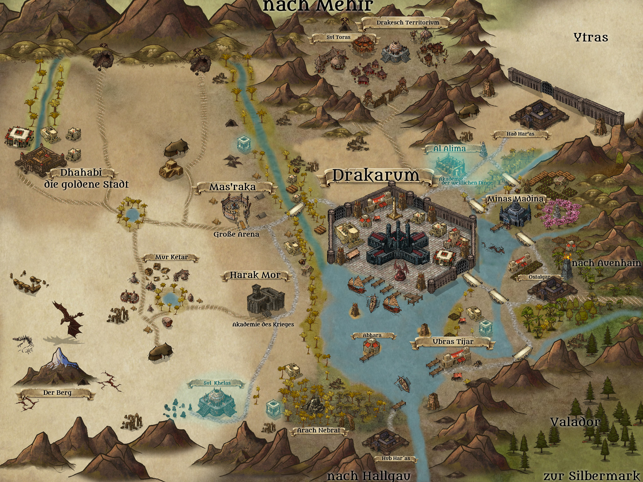 - Die Weiße Bibliothek in Al Alima ist ein imposantes Gebäude aus weißem Marmor. Ihre Fassade ist mit farbigen Malereien und Gold bedeckt. Hier sind nicht nur zahlreiche alte Pergamente als Zeitzeugen der drakischen Geschichte verwahrt. Die Regale sind auch gefüllt mit wissenschaftlichen Abhandlungen, Büchern und Abschriften. Es heißt, dass von jedem drakischen Schriftstück, welches an einem anderen Ort aufbewahrt wird, eine Kopie in der Weißen Bibliothek existiert. Jeder Wissenssuchende, egal welchem Stand er angehört, hat sich in diesen Mauern an das Wort der Bibliothekare zu halten. Waffen, verschmutze Kleidung und Schuhe müssen vor dem Betreten der Räume abgelegt und Hände und Füße gewaschen werden. Der Zugang zu diesem Ort des Wissens wird von Haus Nefrath hin und wieder als Druckmittel genutzt. Wer dem Haus schadet, der sieht sich schnell vom größten Schatz des Landes ausgeschlossen.